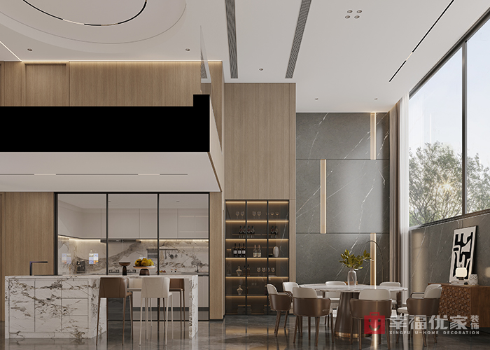 此客户本来就是做建筑的,接触时候土建已经做完了,客户房屋在端头可变性更大,结构及楼梯电梯改动较大。整体设计风格简单而低调。在空间感及用材和小细节上体现客户的品味。做了两个挑高。主要解决搭建后又很多梁柱,特别柱头有点多,负二楼解决楼梯美观,入户大梁问题,变缺点为亮点,运用灯光及格栅隐形门,让入户有一个立体效果,餐厅挑空解决顶面阳光房及负二楼采光问题,立面运用错缝嵌入灯光让墙面不呆板,增加氛围灯光,隐藏式酒窖恒温酒柜岛台增加功能性,方便又简约,干净大方,品质藏小细节里。一楼三楼主要采用引画入室,小区园林很漂亮,把外景引入室内,美不胜收。