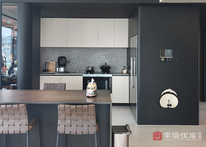 此案173平套四户型,改成套二加一个书房,极简设计,左右分色,左边以黑色肤感柜子和不锈钢板为主,右边白偏一点黄,全屋微水泥,质感非常强,软装上搭配一些色彩较强 的装饰进去点缀整个空间。