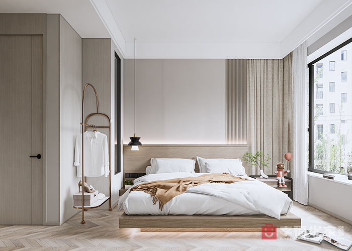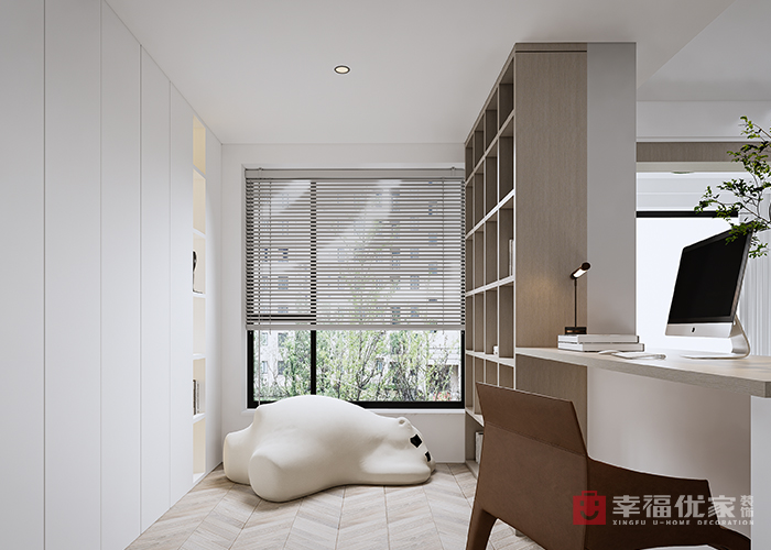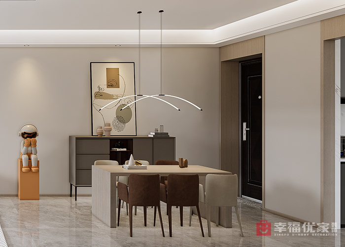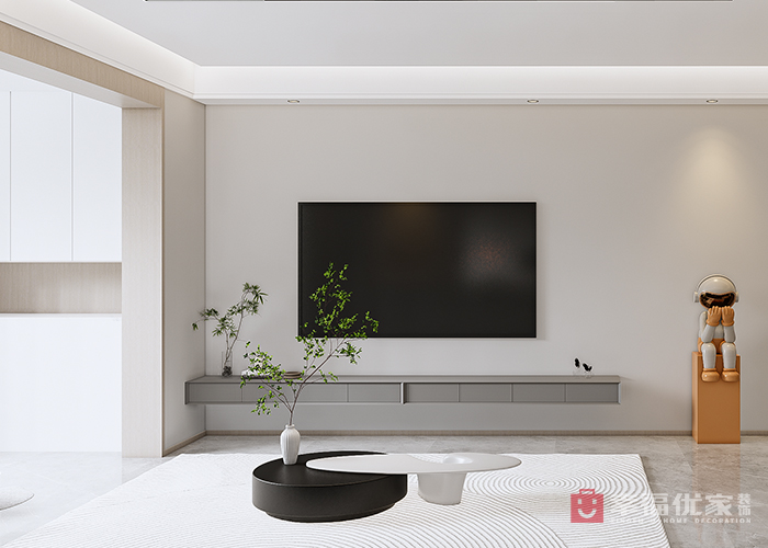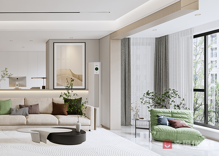 客厅以无主灯设计,主色调为米白色加上局部跳色,营造温暖和安静。