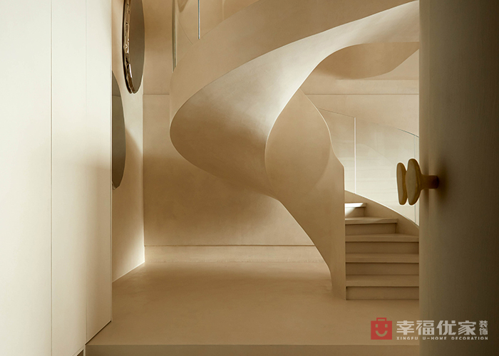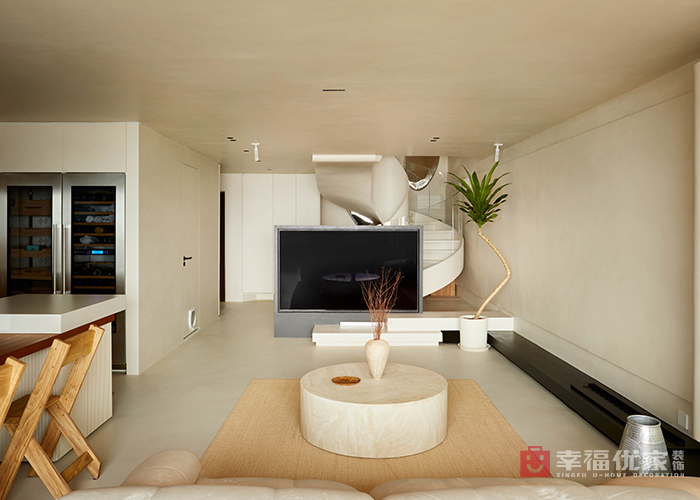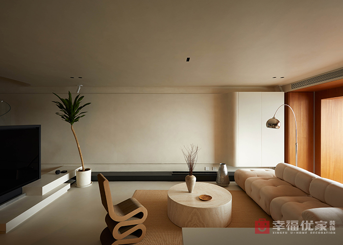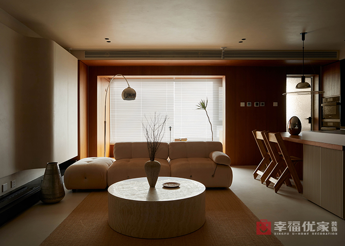 起居室长窗是住宅内绝佳的观景之处。为了突出强化室外独特景致,我们利用低压的梁体加以深色木饰面的整体包裹,打造被拉长的框景效果,使空间具有场景感,延伸感。