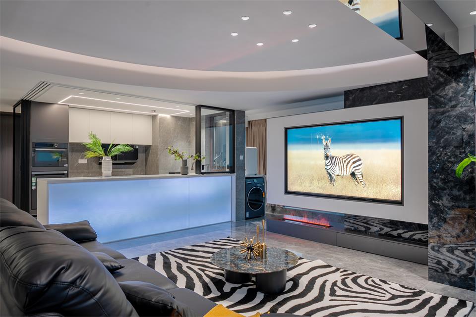 最为精妙的是,二者之间以一道兼具置物与展示功能的开放式隔断区隔。